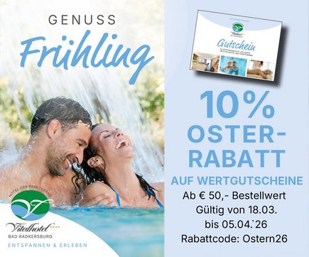 Bestellen Sie Ihren Gutschein direkt online mit RABATT-CODE: OSTERN26 oder erwerben Sie Ihren Gutschein telefonisch oder per Mail: