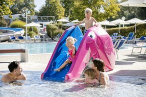 Wasserspaß für jedes Alter: Das Sprudelwasser-Erlebnisbecken mit Innen- und Außenbecken bei angenehmen 32°C, eine Rutsche mit Stripe-Effekt und das Babybecken innen und außen mit einer Elefanten-Rutsche sorgen für jede Menge Spaß und Action.