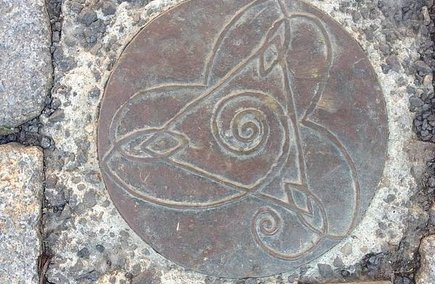 Das Kosmogramm (im Stadtpark) zeigt die beiden Pole der Kraftachse in Form von zwei miteinander tanzenden Spiralen. - Einbindung in das Kraftfeld des Ortes