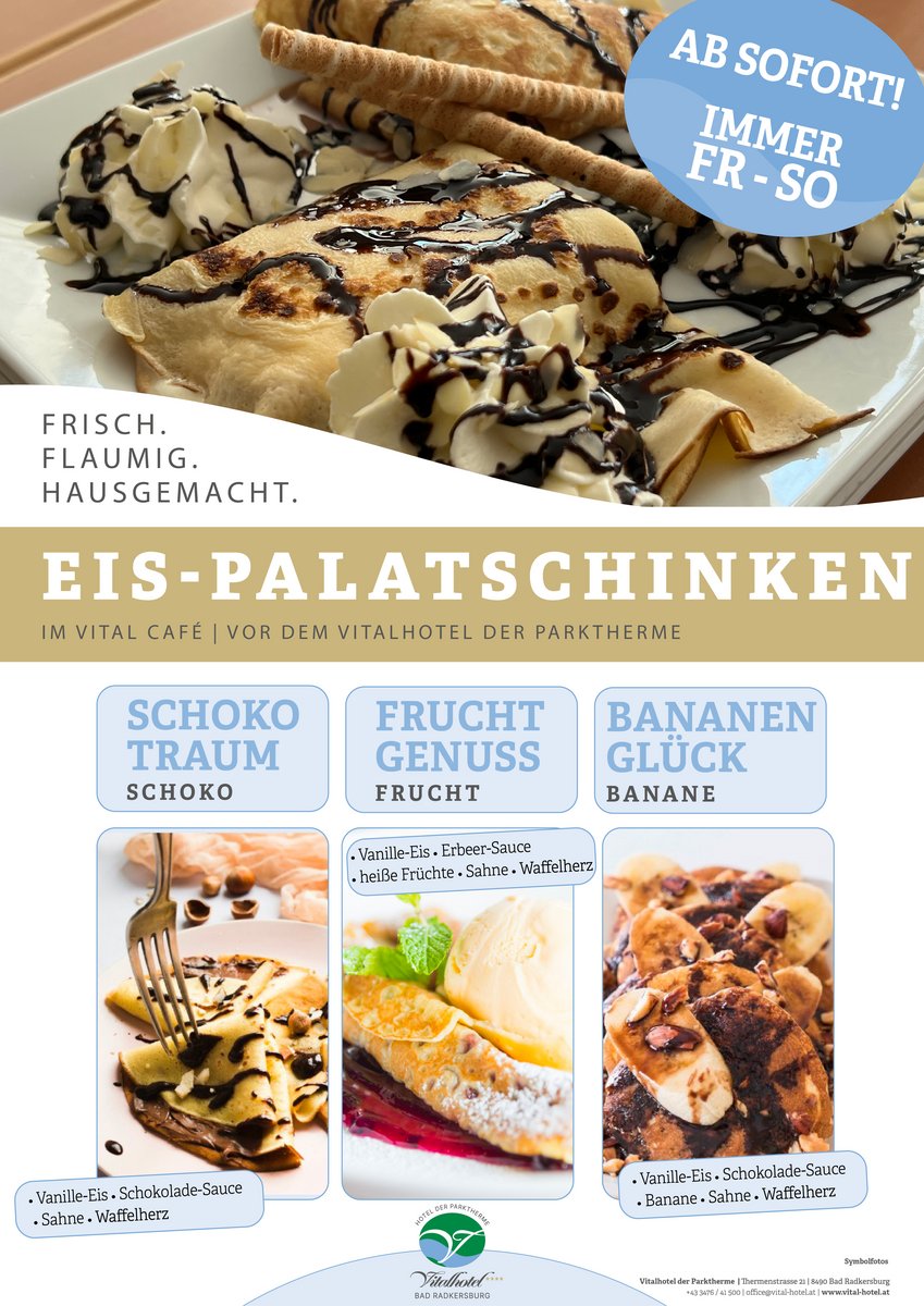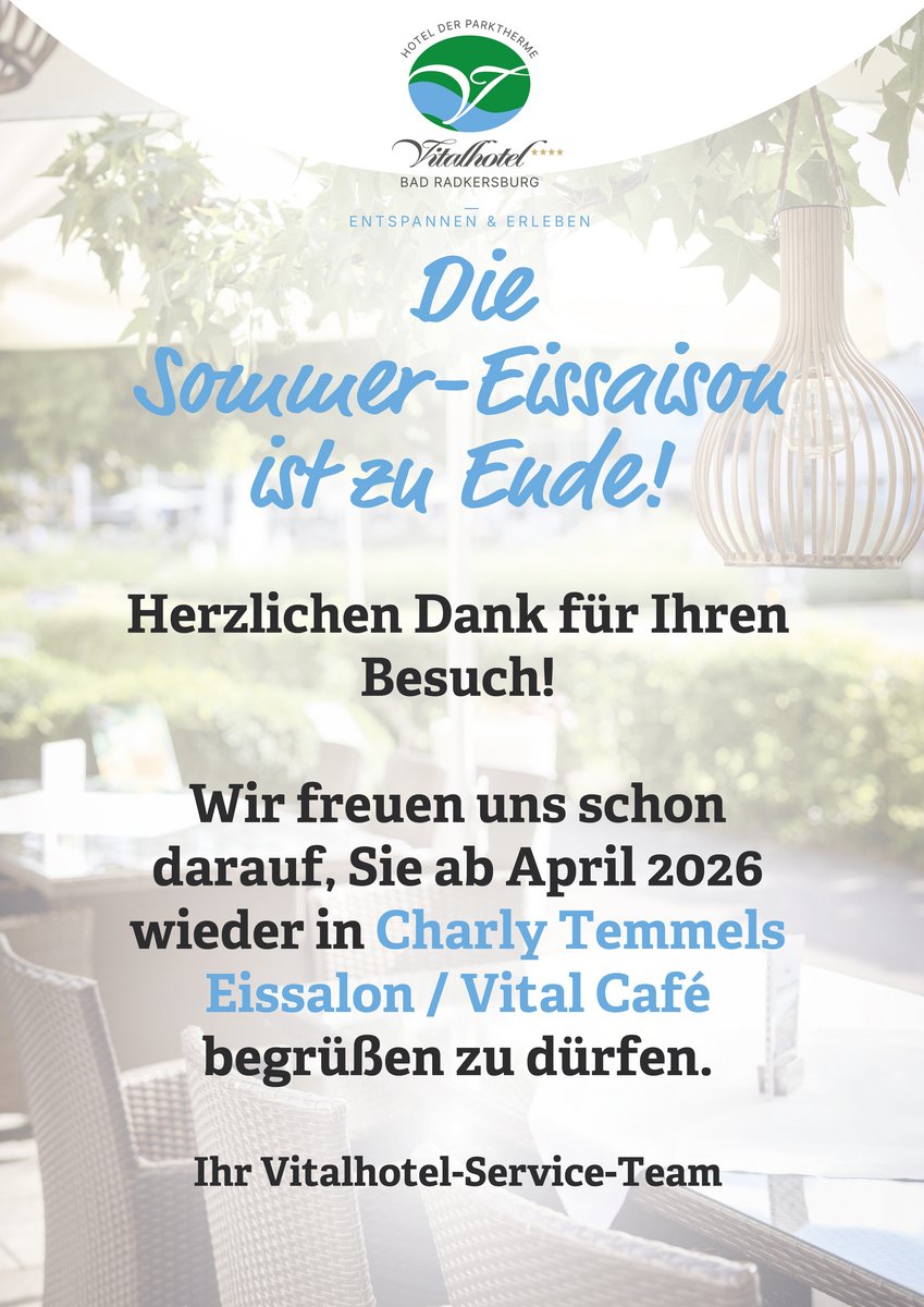 In den Sommermonaten hat unser Vital Café seine Pforten für Sie geöffnet. Auf unserer wunderschönen Terrasse, die liebevoll im italienischen Stil gestaltet ist und ein entspanntes südliches Flair verbreitet, können Sie köstliche Eiskreationen von Charly Temmel genießen. Weiters bieten wir Ihnen Snacks, viele regionale Schmankerl, Cocktails und Kaffee. Auch die schattigen Plätze unter den Palmen eignen sich hervorragend zum Ausspannen und Genießen bei einem kühlen Drink.
