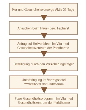Nach Bewilligung durch Ihren Versicherungsträger setzt sich das Vita med Gesundheitszentrum mit Ihnen zur Vereinbarung eines Kur-Termins in Verbindung und reserviert für Sie ein Zimmer im Vertragshotel 4-Sterne Vitalhotel der Parktherme.