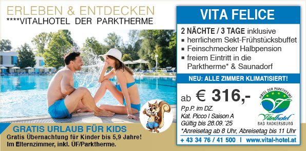 2025 ist somit nicht nur für Frau Wendner ein besonderes Jahr, sondern auch für das gesamte Vitalhotel ein Jubiläumsjahr. In diesem Jahr, 2025, feiert das Vitalhotel der Parktherme Bad Radkersburg sein 25-jähriges Bestehen. Ein Vierteljahrhundert voller Gastfreundschaft, Innovation und unvergesslicher Momente – das möchte das Vitalhotel mit allen Gästen und Freunden feiern.