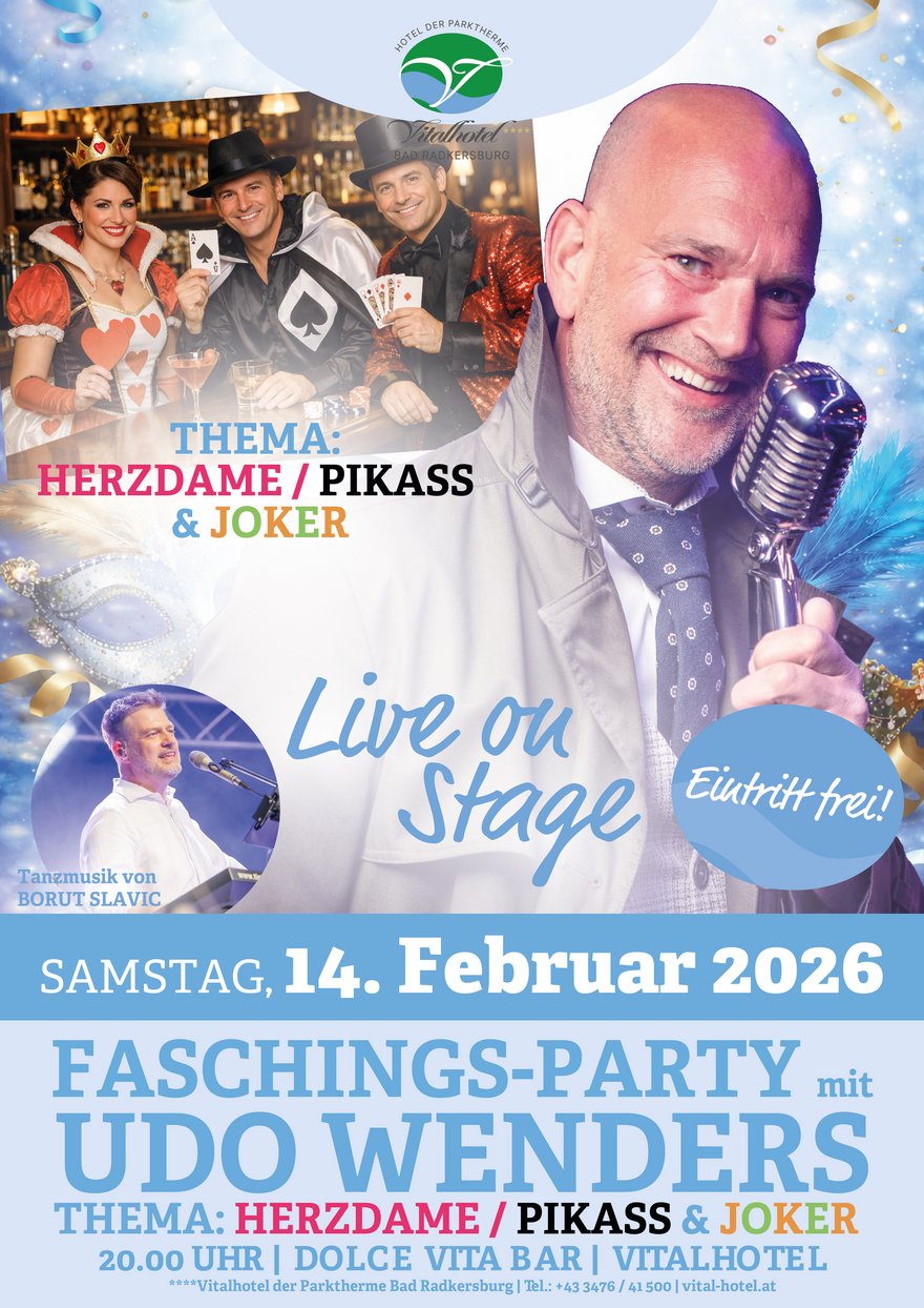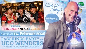 Wenn der Faschings-Samstag auf den Valentinstag fällt, wird gefeiert – und zwar richtig! Am 14. Februar 2026 laden wir sIE herzlich zur großen Faschingsparty mit Udo Wenders ein!