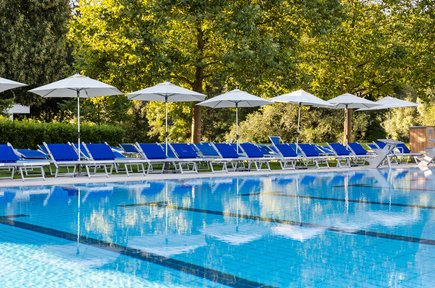 Das 50 Meter-Outdoor Sportbecken lädt mit seinen, ab Ende März garantierten 25°C zu sportlichen Längen und das besondere Thermalwasser bei entspannenden 34-36°C zum Relaxen.