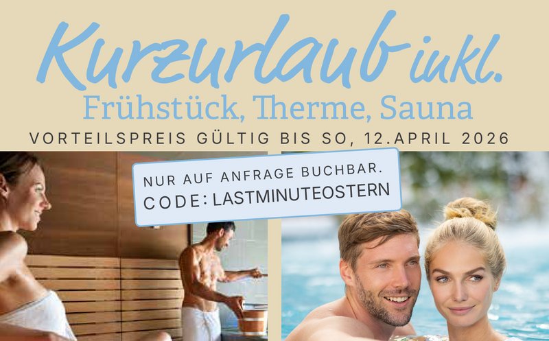 Schnell sein lohnt sich! Gültig für alle Nächtigungen im Reisezeitraum bis Sonntag, den 12. April 2026 - neue Reservierungen.