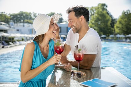An der Poolbar "Lava Lounge", genießt man erfrischende Cocktails und köstlichen Kaffee in mediterranem Flair – direkt neben dem 50 m-Sportbecken der Parktherme.