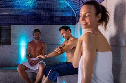Das großzügige Saunadorf der direkt verbundenen Parktherme präsentiert sich mit acht verschiedenen Saunen als einzigartige Welt der Entspannung und des Wohlfühlens. Im Saunadorf erwarten Sie herrliche Düfte und Cremen, Crushed Ice, gemütliche Ruhe- und Liegeräume, ein großzügiger FKK-Saunagarten, die Genussbar mit regionalen Köstlichkeiten und vieles mehr.