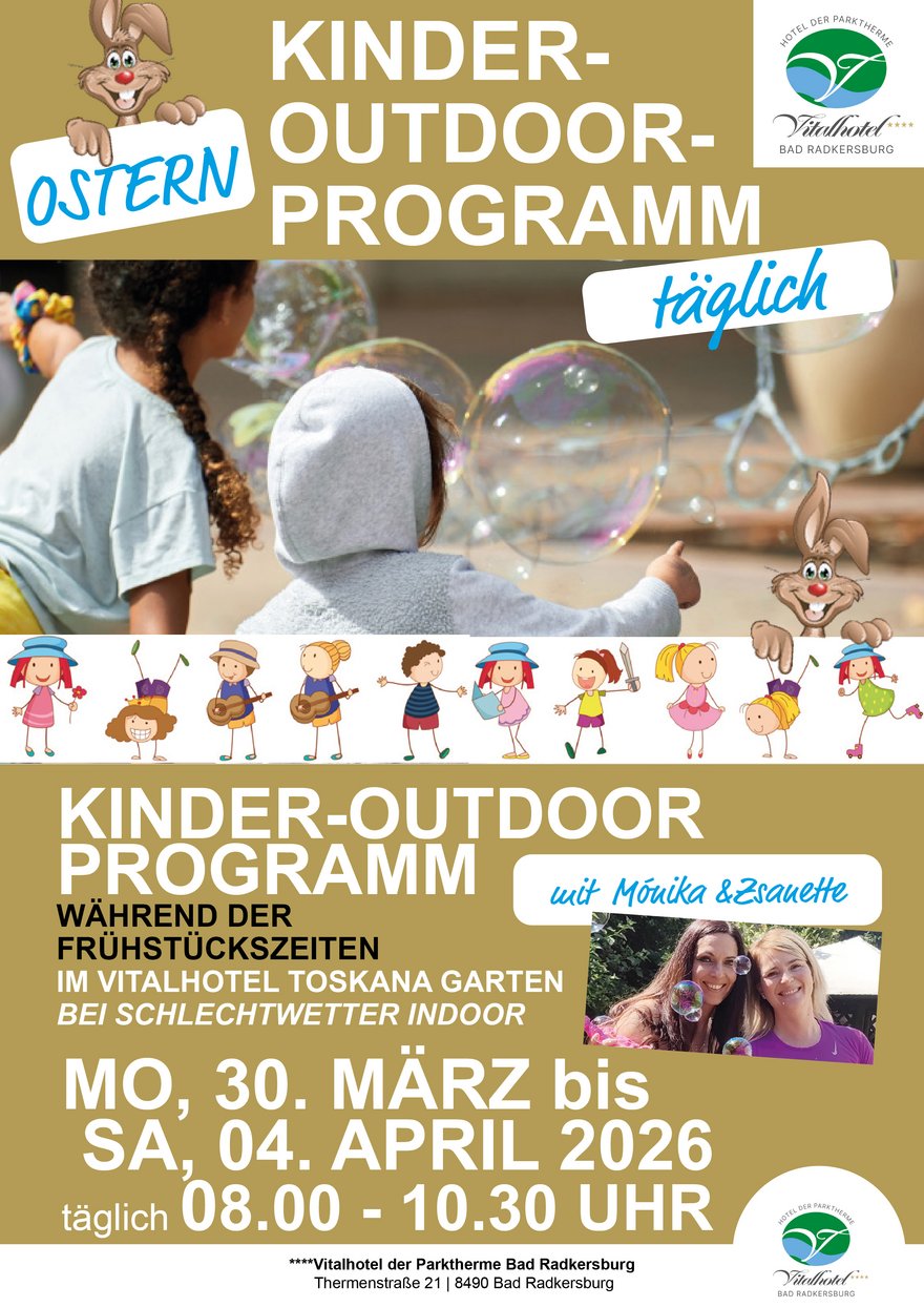 - Oster-Outdoorprogramm für Kinder: Täglich vom 30. März bis 04. April 2026 im Vitalhotel Toskana-Garten – Spaß und Abenteuer während der Frühstückszeiten!