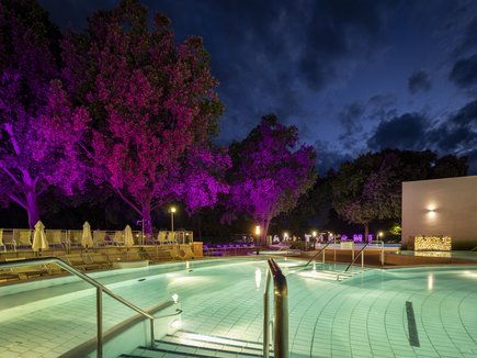 Sie starten Ihren Wellnesstag mit unserem umfangreichen Frühstücksbuffet, aus über 150 verschiedenen Speisen und Getränken und begeben sich anschließend in die große Welt der Entspannung der Parktherme inklusive Saunadorf. Schwebend im wohlig warmen Thermalwasser, schaffen sanft wechselnde Lichtstimmungen in der naturnahen Parklandschaft ein außergewöhnliches Thermenerlebnis für alle Sinne. Erleben Sie traute Zweisamkeit auf der Partner-Hängematte und genießen Sie ruhige Momente in den heimeligen Liegeräumlichkeiten mit Ausblick auf die natürliche Parklandschaft. Für Tiefenentspannung sorgt vorallem die Kräuter-Salz-Grotte und der Licht-Klang-Tempel.