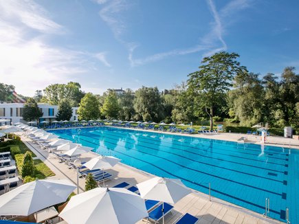 Das 50 Meter-Outdoor Sportbecken lädt mit seinen, ab Ende März garantierten 25°C zu sportlichen Längen und das besondere Thermalwasser bei entspannenden 34-36°C zum Relaxen.