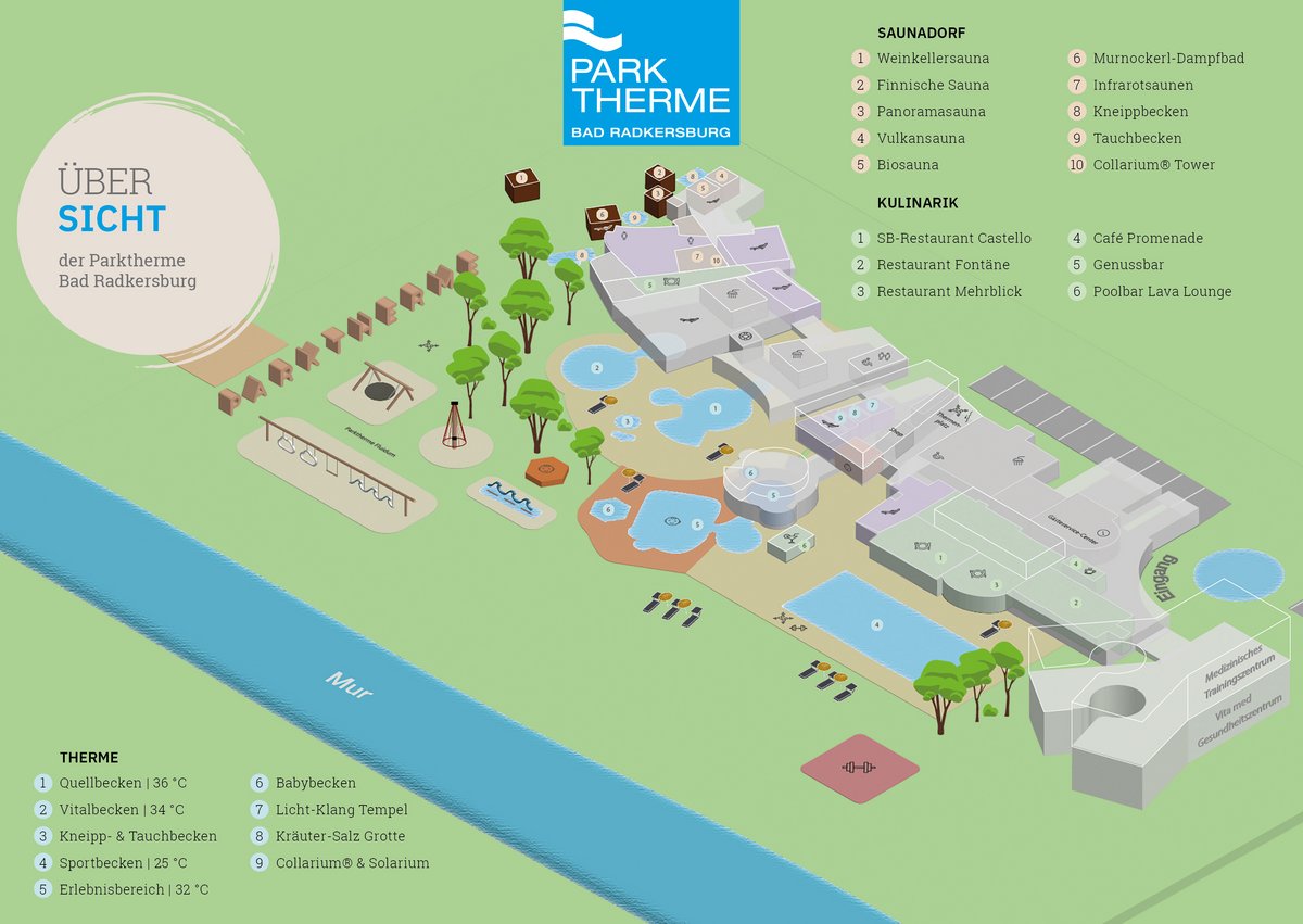 Die bereits mehrfach ausgezeichnete Parktherme Bad Radkersburg präsentiert sich voll Herzlichkeit und Gemütlichkeit im Thermen- & Vulkanland Steiermark. Als einzigartige 3.600 m² große Welt der Entspannung und Aktivität ist die Parktherme über einen Bademantelgang mit dem Vitalhotel verbunden.