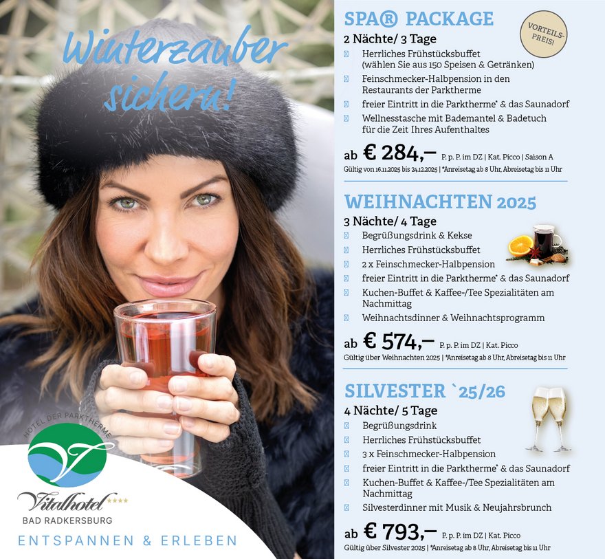 Entspannen im mineralstoffreichen Thermalwasser der direkt verbundenen Parktherme Bad Radkersburg, regenerierende Saunaaufgüsse im Saunadorf spüren, die Weihnachtskulisse in der naheliegenden Altstadt von Bad Radkersburg erleben, regionale Köstlichkeiten im Rahmen der Halbpension genießen und den Abend bei einem Glas Wein am knisterndem Kamin ausklingen lassen.