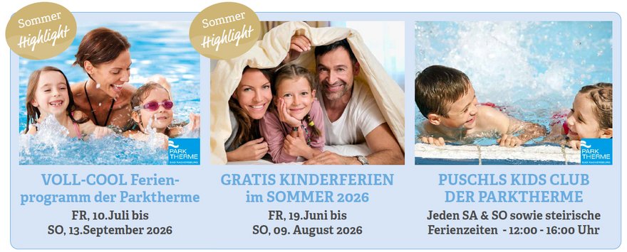 - Kinderbetreuung im Kinder Club - das Betreuungsteam der Parktherme sorgt bei der Kinderbetreuung für grenzenlosen Urlaubsspaß während den steirischen Semesterferien, an den Wochenenden (SA & SO), an Feiertagen sowie Fenstertagen von 12.00 bis 16.00 Uhr für Kinder ab 3 Jahren.