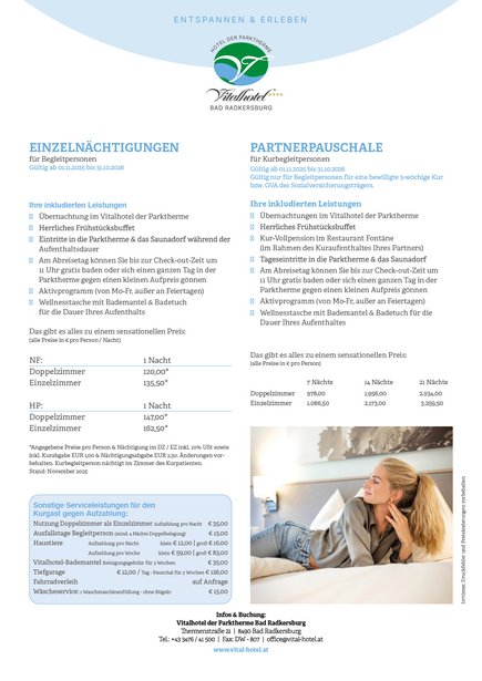 Ein Bekannter oder ein Familienmitglied verbringt einen Kuraufenthalt im Vitalhotel der Parktherme Bad Radkersburg und Sie möchten Ihn / Sie gerne begleiten? Dann empfehlen wir Ihnen unsere Kur-Partnerpauschale.