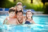 Wasserspaß für jedes Alter: Das Sprudelwasser-Erlebnisbecken mit Innen- und Außenbecken bei angenehmen 32°C, eine Rutsche mit Stripe-Effekt und das Babybecken innen und außen mit einer Elefanten-Rutsche sorgen für jede Menge Spaß und Action.