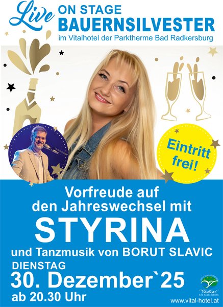 "Mr. Steirerbluat" bringt mit seiner Mischung aus Schlager und rockiger Volksmusik beste Laune, während Styina das Programm mit ihren gefühlvollen Titeln perfekt ergänzt. Freuen Sie sich auf einen unvergesslichen Jahresausklang mit großartiger Musik zum Mitsingen und Mitfeiern!
