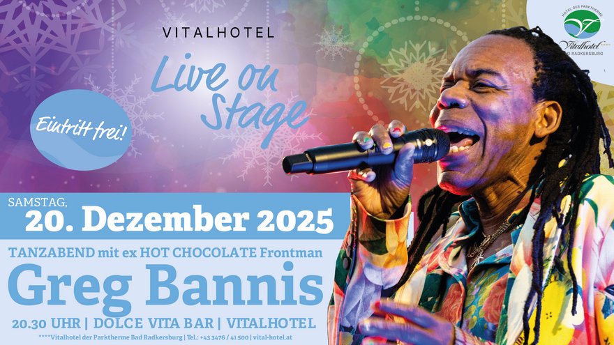 Am Samstag, den 20. Dezember, dürfen wir uns auf ein ganz besonderes Highlight freuen: GREG BANNIS, der ehemalige Frontmann der Kultband „Hot Chocolate“, ist zu Gast im Vitalhotel!