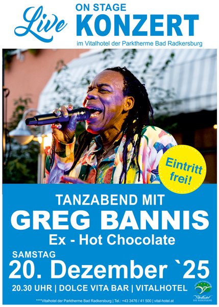 Am Samstag, den 20. Dezember, dürfen wir uns auf ein ganz besonderes Highlight freuen: GREG BANNIS, der ehemalige Frontmann der Kultband „Hot Chocolate“, ist zu Gast im Vitalhotel!